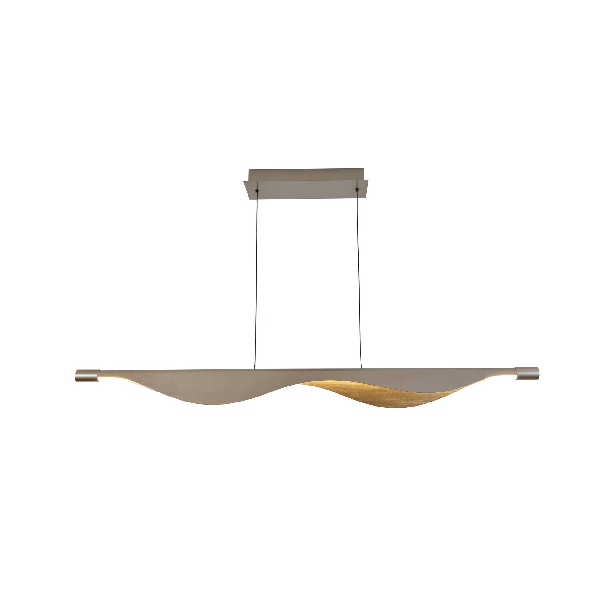 En dekorativ taklampe i metall med en pendel formet som en bølge. Pendelen er børstet grå på utsiden og messingfarget på innsiden. Den setter preg på rommet, og passer perfekt over spisebordet. Lampen har integrert LED-lys.