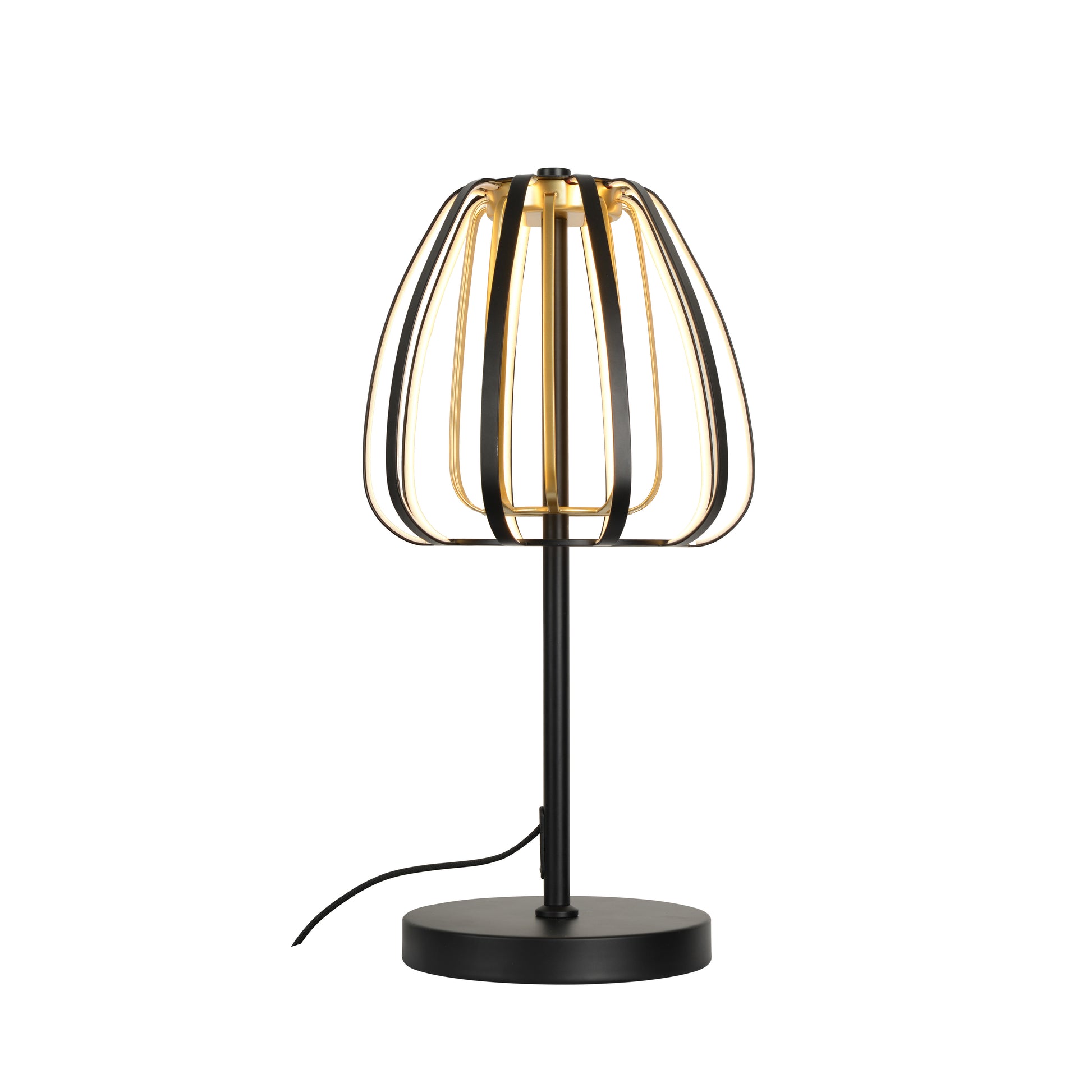 En dekorativ bordlampe i sort metall med stabil lampefot og en smal arm. Lampen har en kuppel med sorte og gullfargede metallspiler som gjør at lampen gir rommet et fint preg. Kuppelen har diameter på 23cm, og lampen er 15cm høy. Integrert LED. 2.5m lang ledning.
