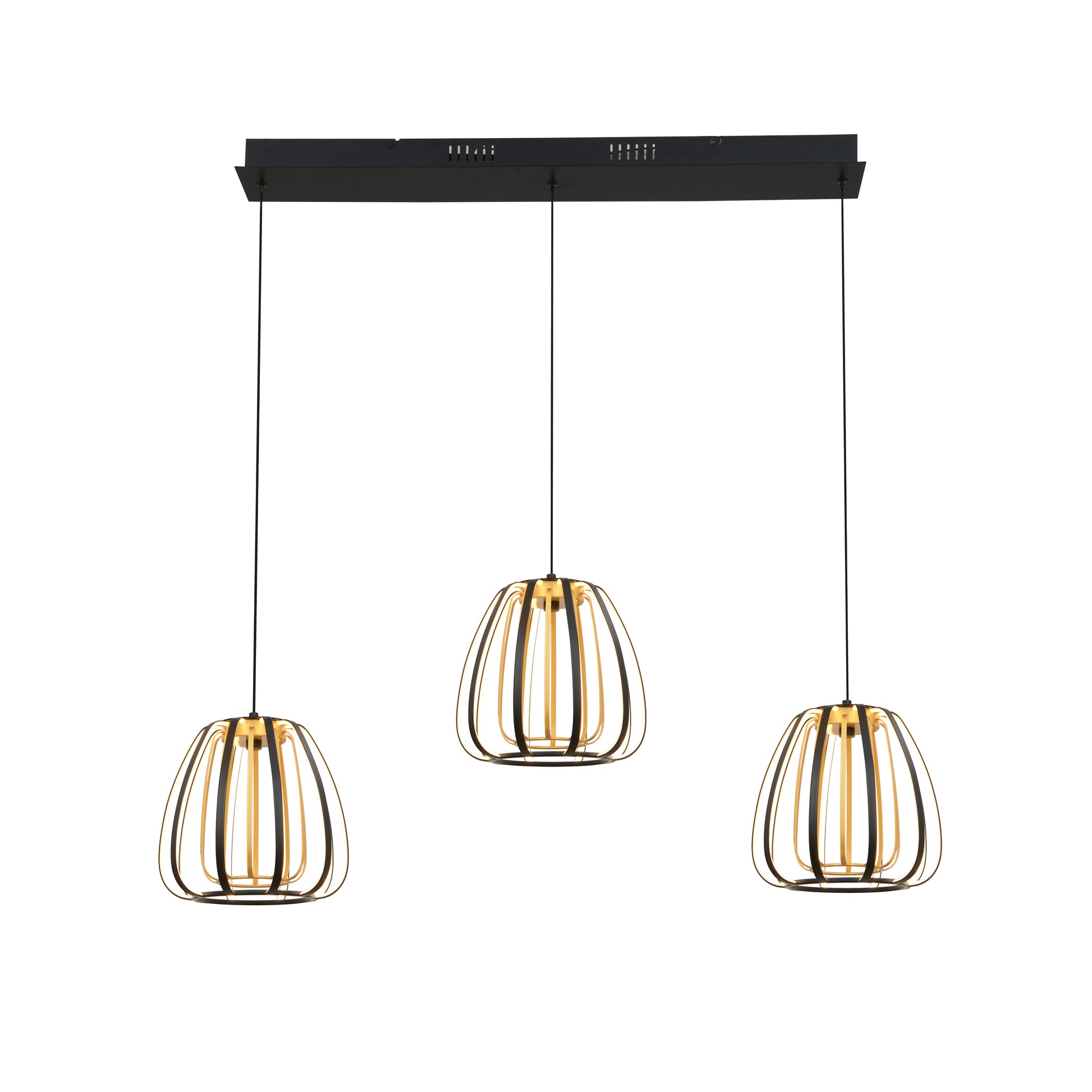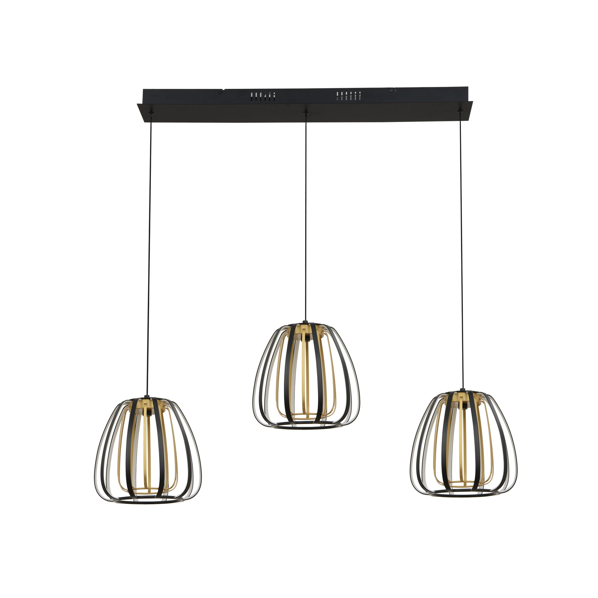 En stilig taklampe laget av metallspiler i gull og sort med tre pendler hengende på en rekke. Lampen gir et kreativt preg til rommet enten det er over spisebordet eller på soverommet. Lampen har tre lyskilder med integrert LED.