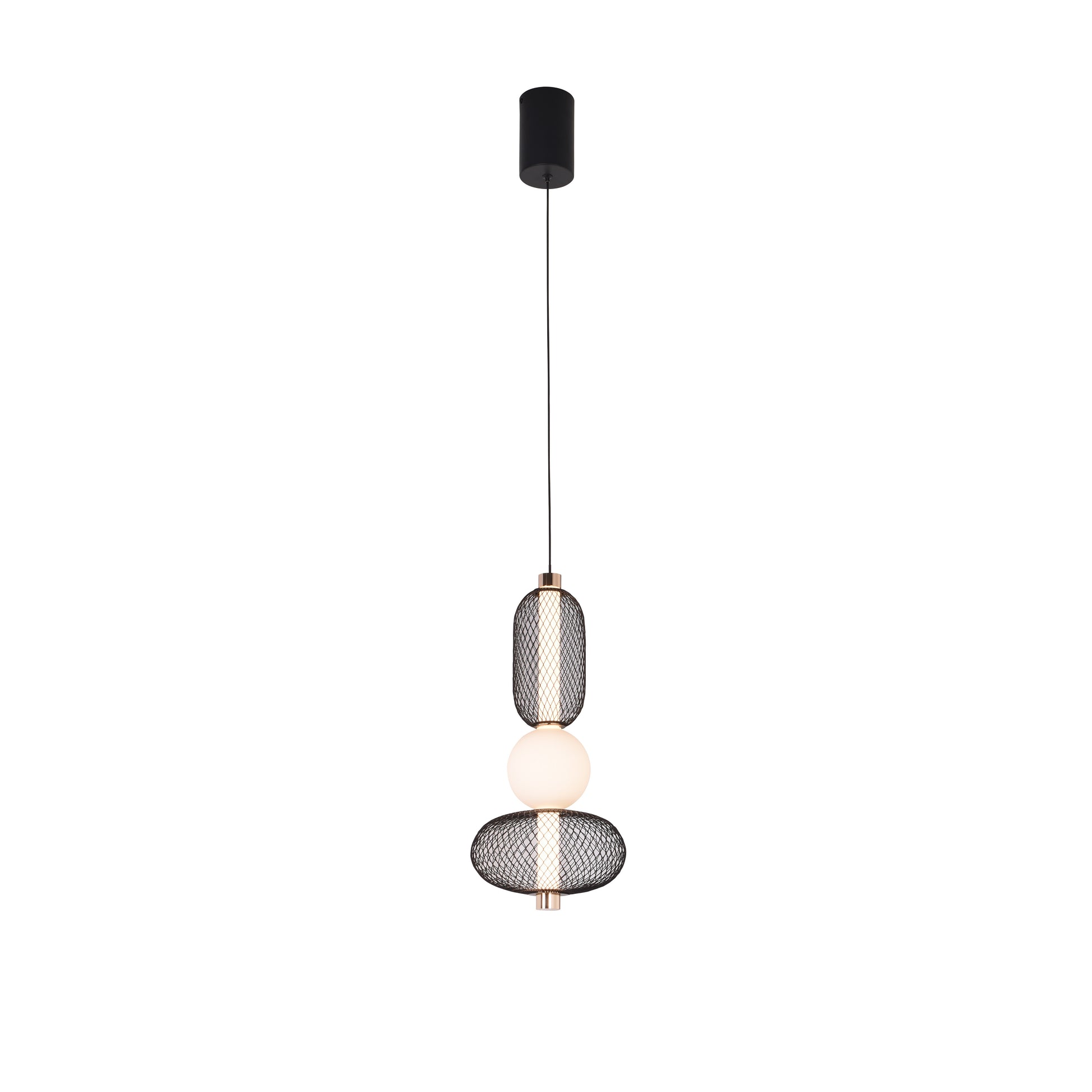 En dekorativ taklampe i sort metall med detaljer i messing. Takpendelen har en bred søyle med integrert LED-lys. Rundt søylen har lampen to ovalformede vevede rottinger og en opalfarget kuppel i glass mellom med messingdetaljer nederst. Lampen gir et kreativt preg på rommet ditt, og gjør seg ekstra godt sammen med lampene i samme serie. Monteres med takkrok.