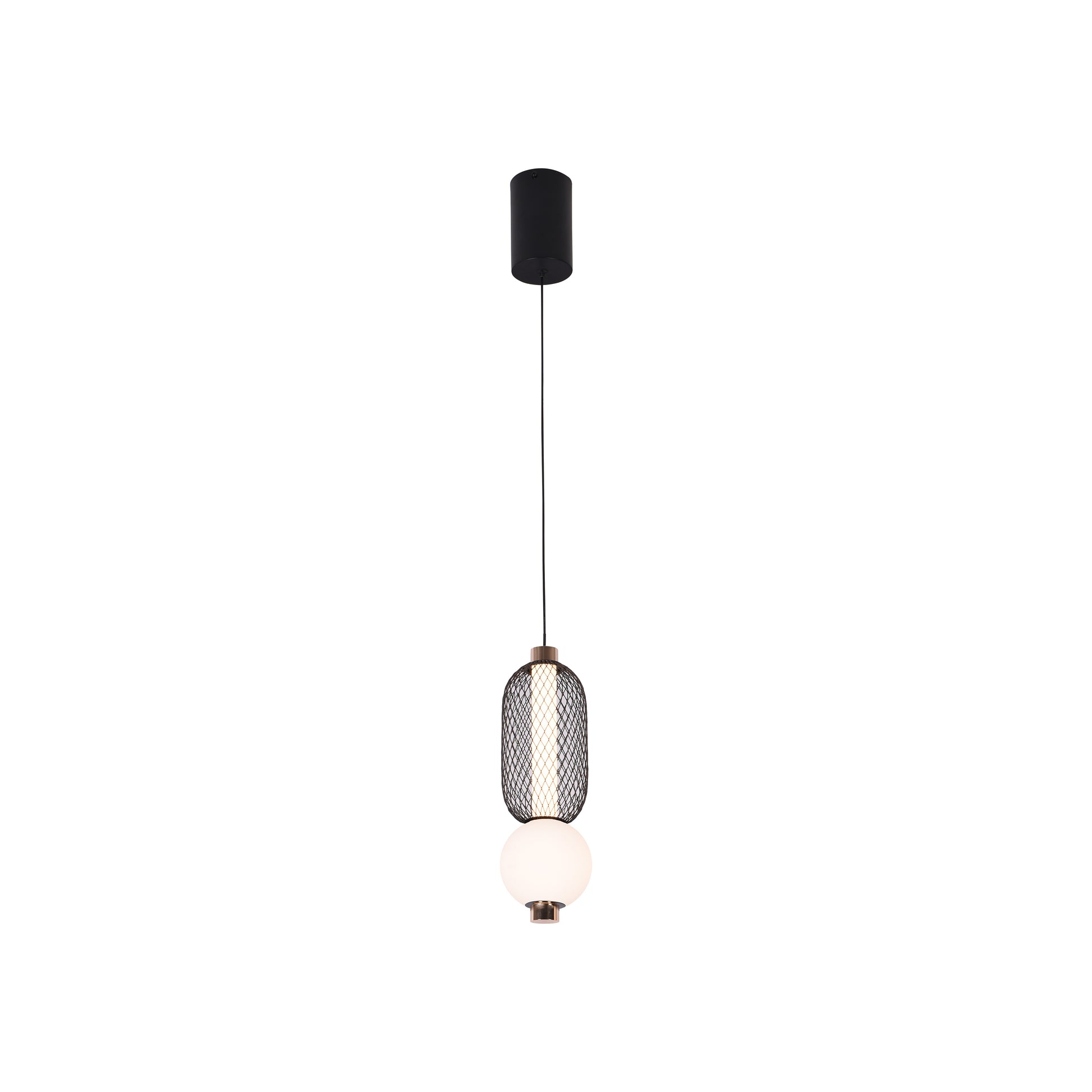 En dekorativ taklampe i sort metall med detaljer i messing. Takpendelen har en bred søyle med integrert LED-lys. Rundt søylen har lampen ovalformet vevet rotting og en opalfarget kuppel i glass med messingdetaljer nederst. Lampen gir et kreativt preg på rommet ditt, og gjør seg ekstra godt sammen med lampene i samme serie. Monteres med takkrok.