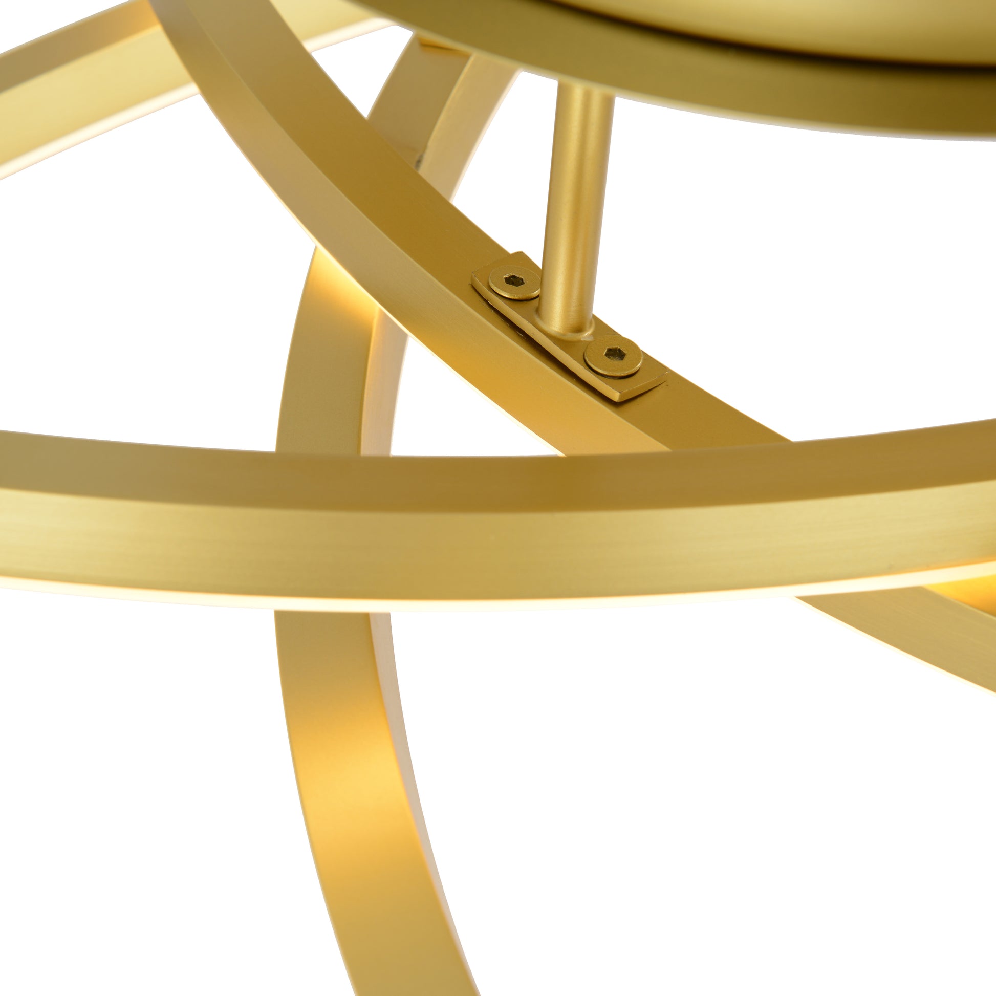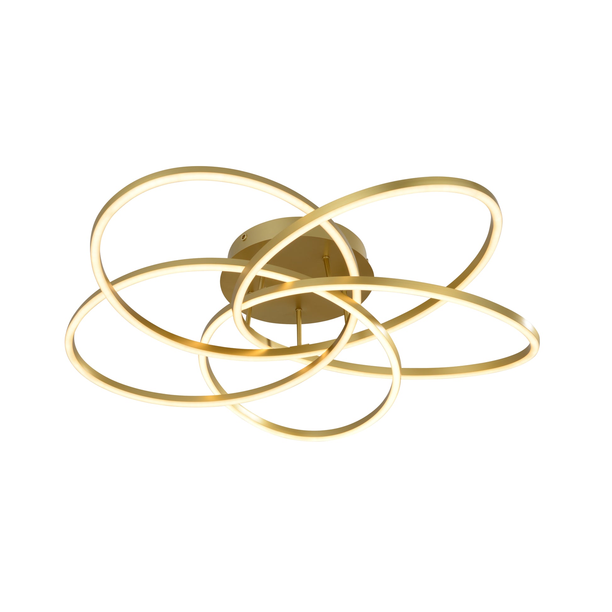 Denne taklampen er virkelig unik og setter sitt preg på interiøret! Lampen har fem sirkler festet i hverandre som danner en kreativ og geometrisk form. Lampen er laget av stål og aluminium, og har integrert LED-lys på innsiden av hver sirkel. Lyset er varmhvitt (2700K) og styrken går opp til 2751lm. Det finnes en liten knapp på selve lampen som gjør at du kan justere fargetemperaturen (2700-3000-4000K). Lengden og bredden på lampen er 76cm. Den bygger kun ca. 17cm ned fra taket og passer derfor utmerket i rom med lavere takhøyde. Lampen har 3-step dim som gjør at du enkelt kan dimme den ved hjelp av lysbryter. Det er dessverre ikke mulig å montere annen type dimmer til denne lampen.