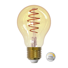 Amberfarget normalpære med E27 sokkel. LED-pæren er dimbar og gir fra seg varmhvitt lys (2100K).