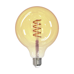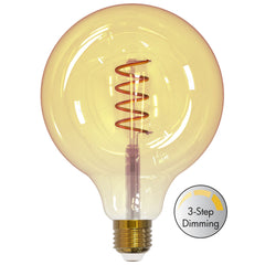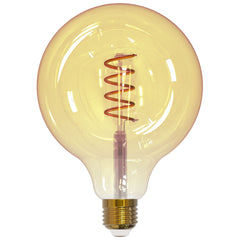 Stilig globepære Ø95mm i amberfarget glass og med spiralformet lystråd. Varm fargetemperatur på 2100K. 3-stegs dimbar.