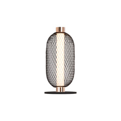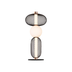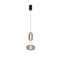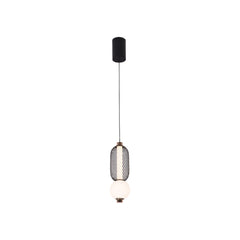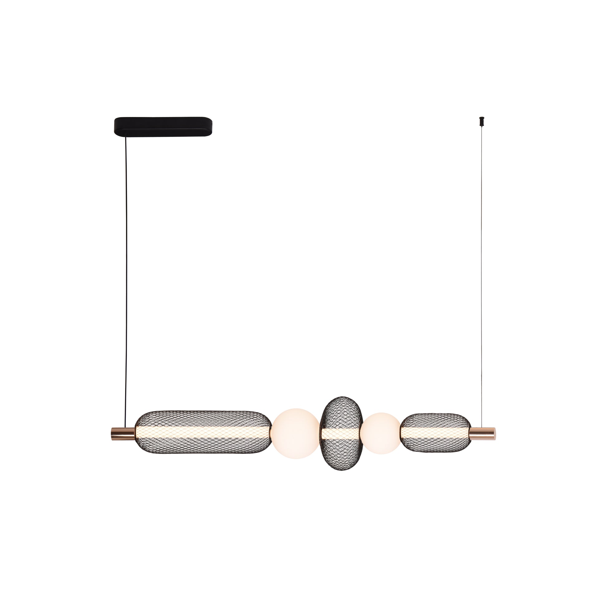 En dekorativ taklampe i sort metall med detaljer i messing. Takpendelen har en lang og bred søyle med integrert LED-lys. Rundt søylen har lampen tre ovalformede vevede rottinger og to opalfargede glasskupler mellom med messingdetaljer på hver side. Lampen gir et kreativt preg på rommet ditt, og gjør seg ekstra godt sammen med lampene i samme serie. Monteres med takkrok.