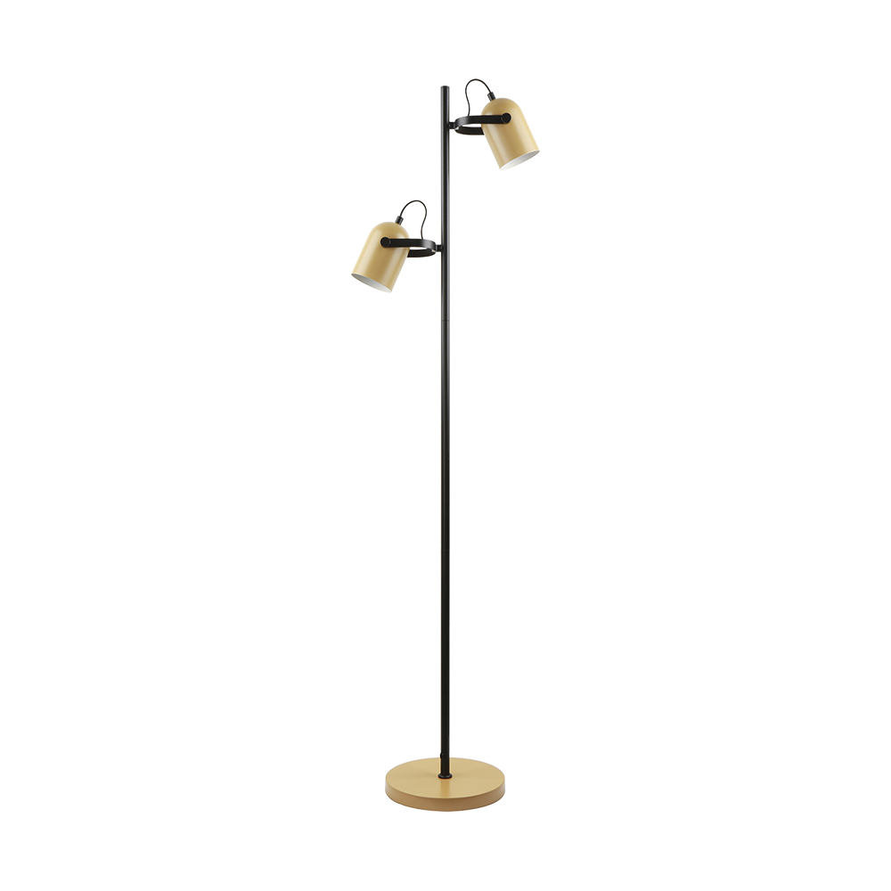Klassisk 2-lys gulvlampe i okergul metall med tiltbare lampehoder. Lampen egner seg godt som leselampe ved siden av sofaen eller lenestolen med sine tette lampeskjermer. Med sitt enkle design, kler den like godt å brukes som ekstra stemningslys. Fotbryter og 2x E27 sokkel.