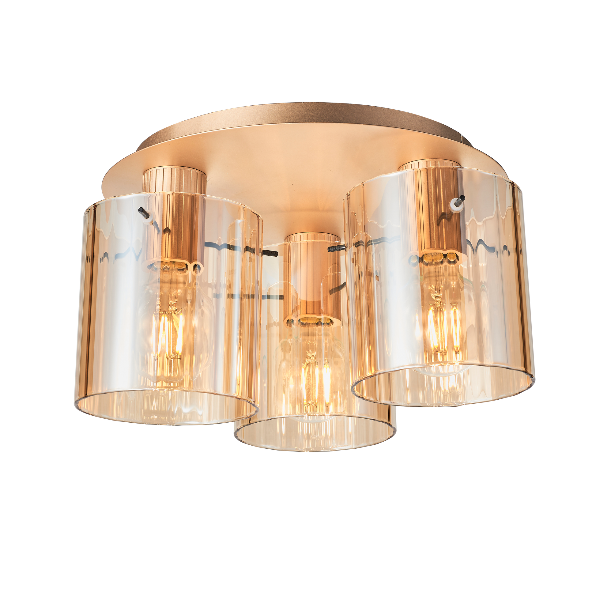 En dekorativ taklampe med tre lampeskjermer i amberfarget glass. Takplaten og soklene er i gullfarget metall. Lampen gir et elegant preg, og pynter opp ethvert rom. Diameter på kuplene er 14cm. 3xE27 lyskilder må kjøpes separat.
