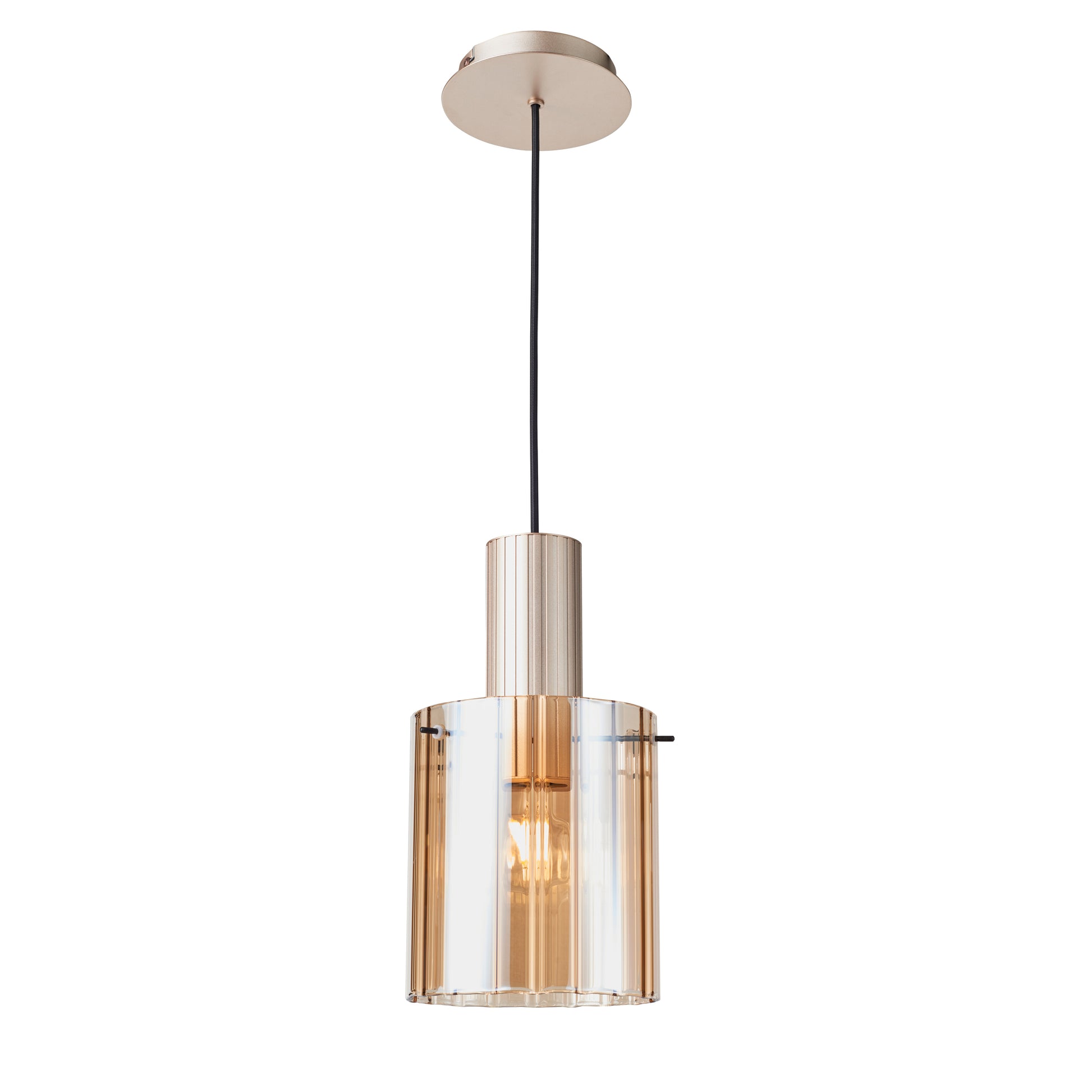 En dekorativ taklampe med lampeskjerm i amberfarget glass. Takplaten og sokkelen er i gullfarget metall. Lampen gir et elegant preg, og pynter opp ethvert rom. Diameter på kuppelen er 18cm og lampen kan nå maks høyde på 150cm.1xE27 lyskilde må kjøpes separat.