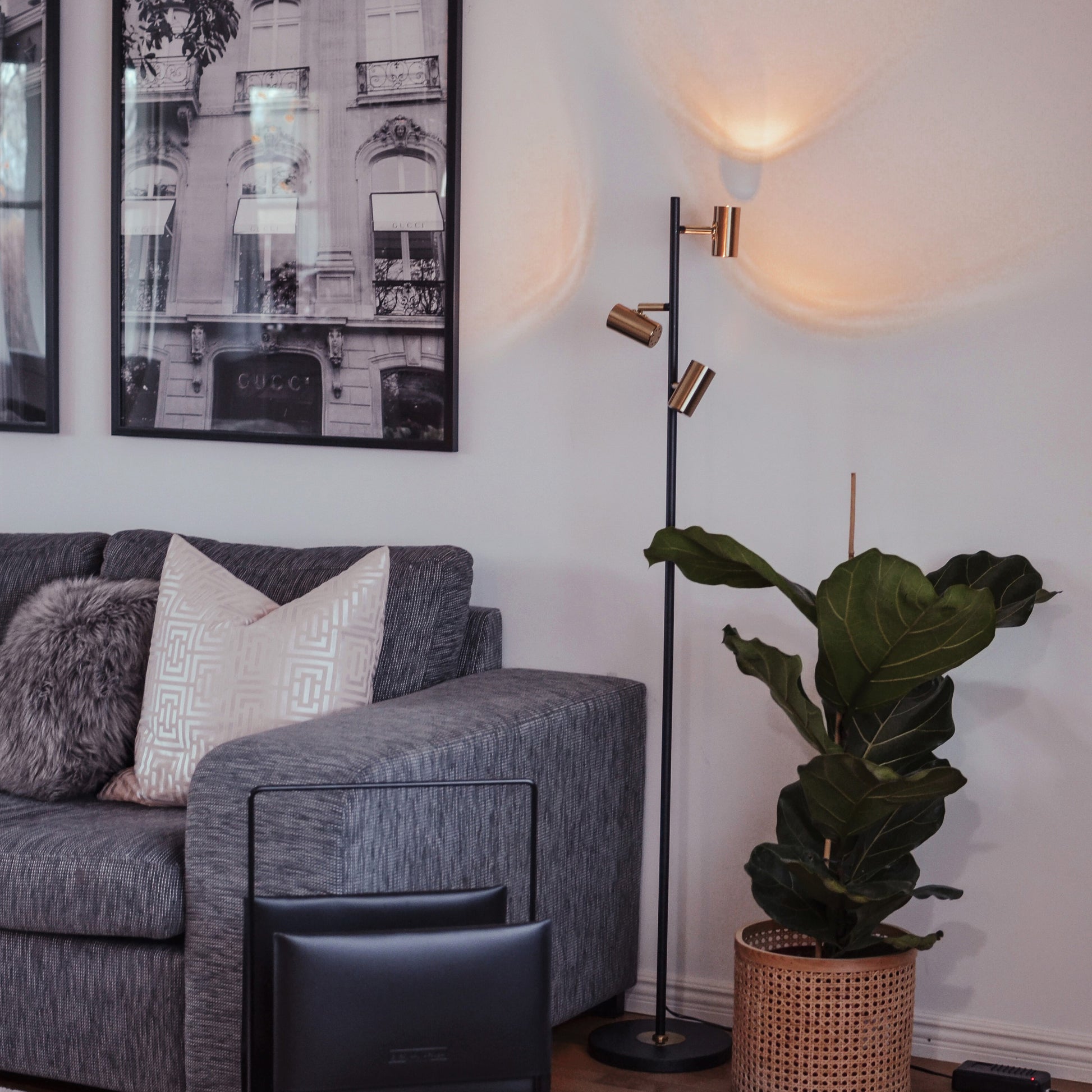 Delikat gulvlampe i sort metall med tre lampehoder i messing som er tilt- og roterbare. Lampen er 135cm høy og har 200cm ledning. Den passer perfekt som ekstra leselys i stuen eller på hytta. Lampen har intergrert LED-pærer.