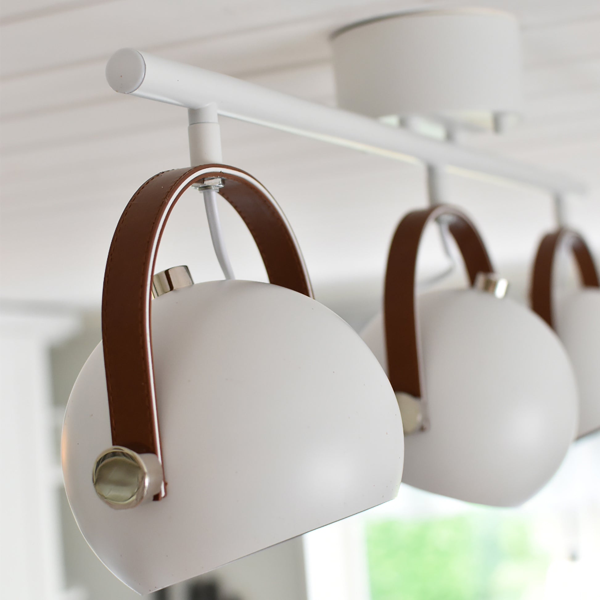 En stilig og moderne taklampe i hvitlakkert metall med detaljer i krom og brunt kunstlær. Lampen har tre justerbare og runde lampehoder i hvitt metall som gjør at du kan rette lyset dit du ønsker. Du trenger 3stk GU10-pærer til lampen.