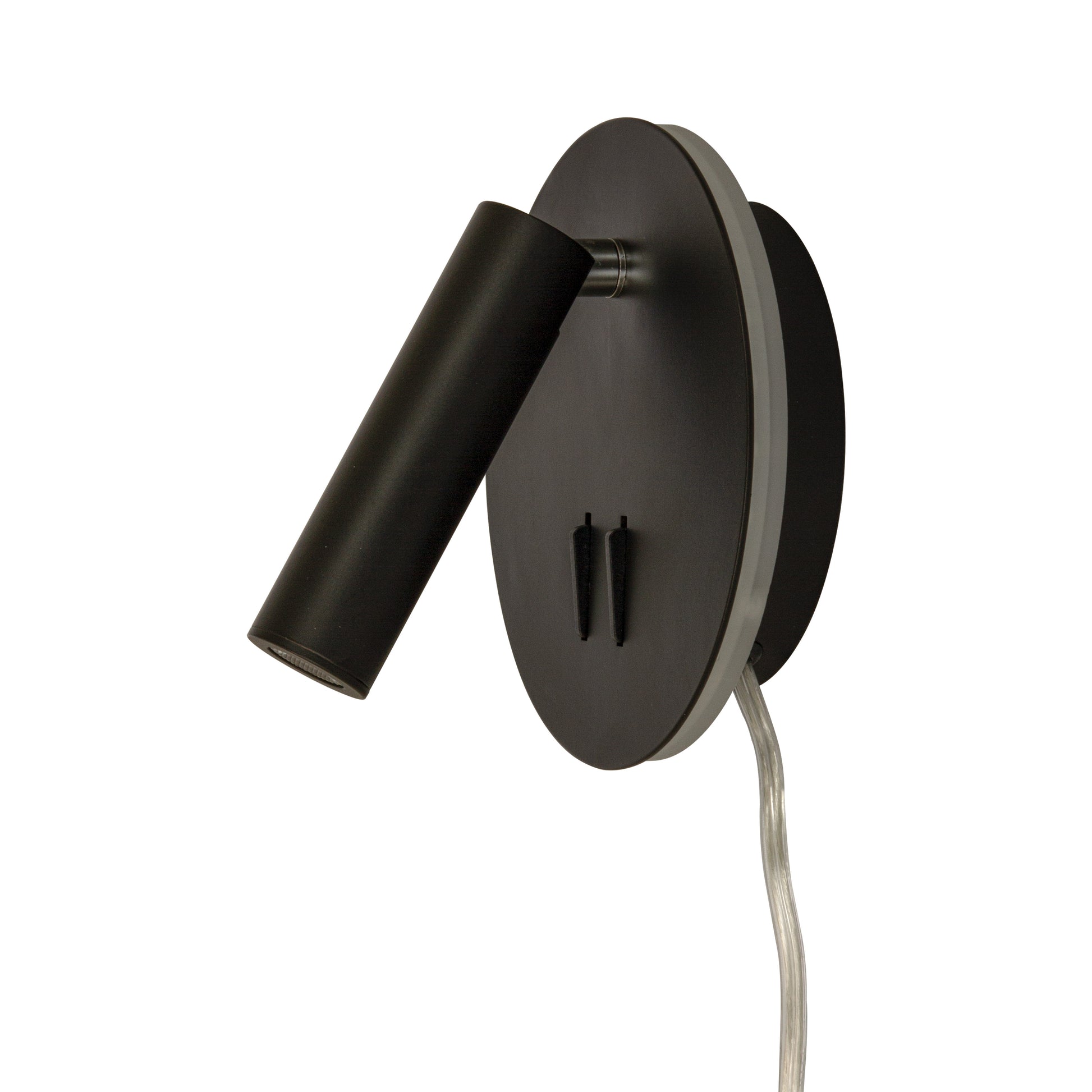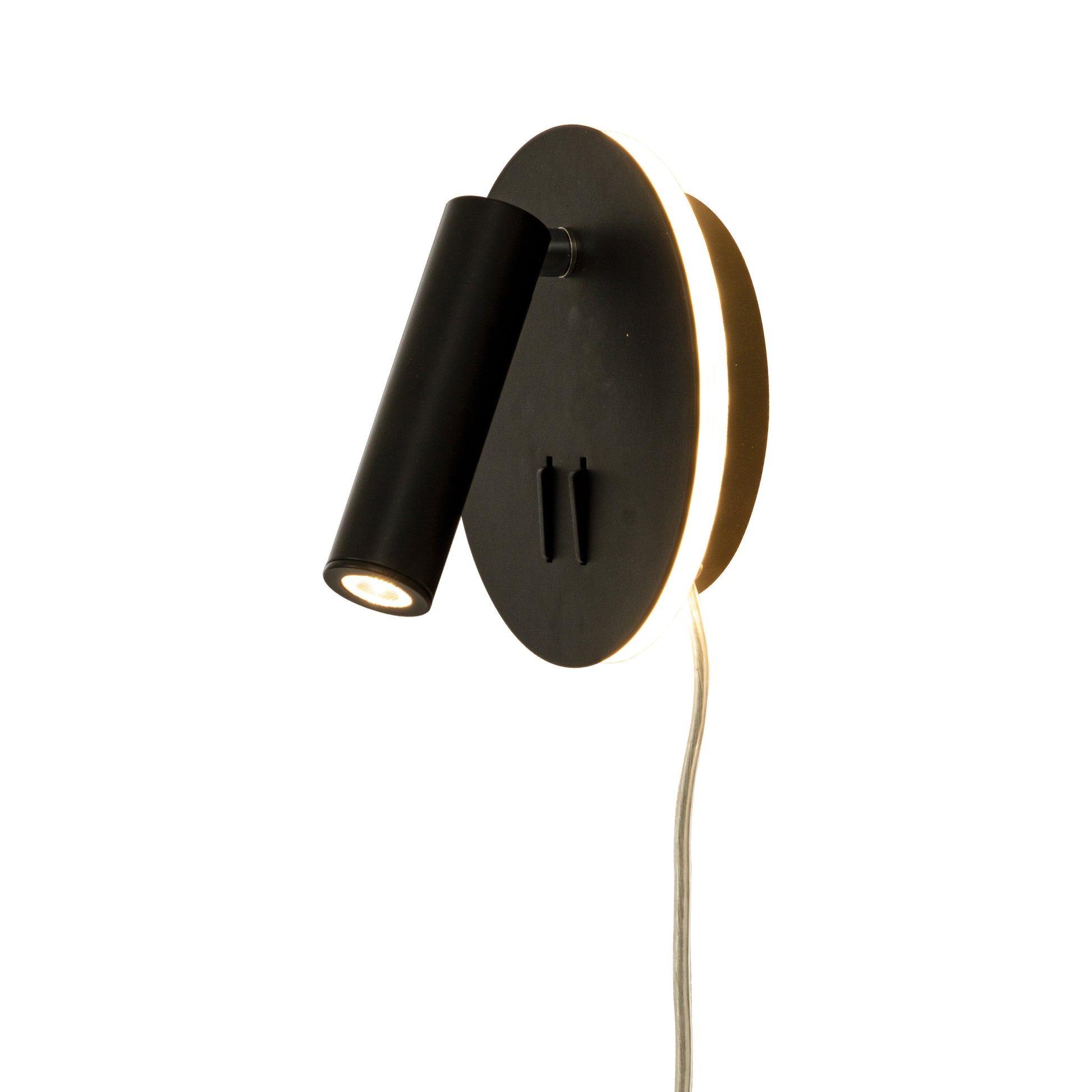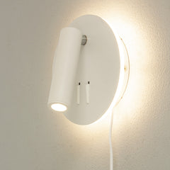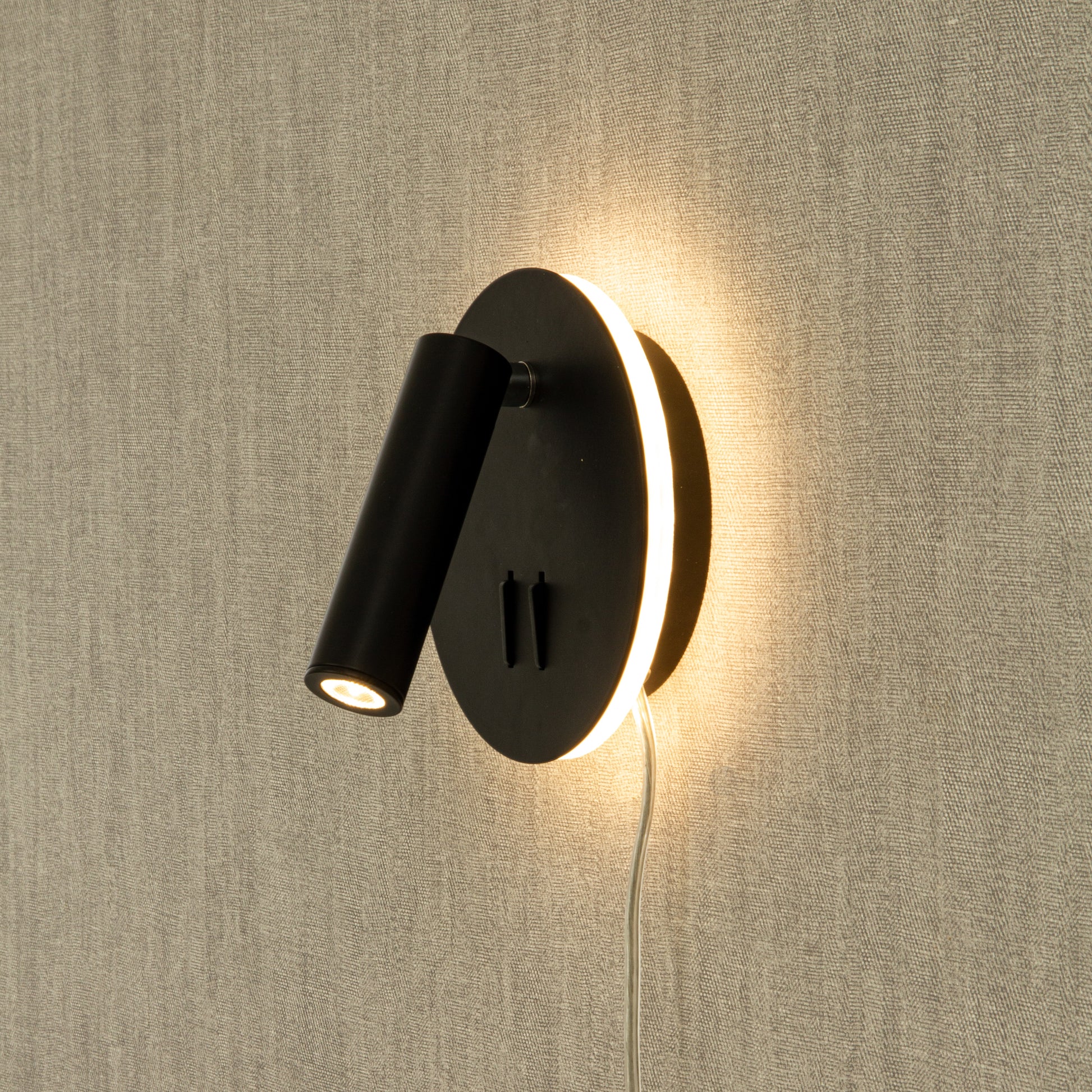 En vegglampe i stilrent og moderne design. Lampen er i sortfarget metall med integrert LED-belysning. Veggspotten har en sylinderformet lampeskjerm som gir godt og konsentrert leselys. Den kan justeres slik at du får ekstra lys der du har behov for. I tillegg har lampen indirekte belsyning som lyser opp veggen rundt lampen. Hver av lysene har hver sin bryter på veggfestet.