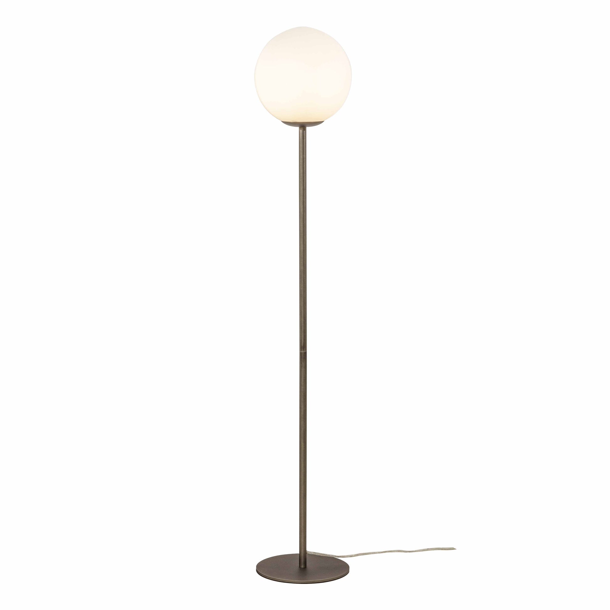 n stilren og tidløs gulvlampe, som også blir et dekorativt innslag i rommet. Lampen er laget av tinn og med en opal glasskuppel på toppen. Lyset spres mykt og behagelig gjennom det opale glasset. Lampen er 130cm høy og har fotbryter. Liten E14 sokkel. Fullfør stilen på belysningen ved å kombinere den med andre lamper i Molekyl-serien.