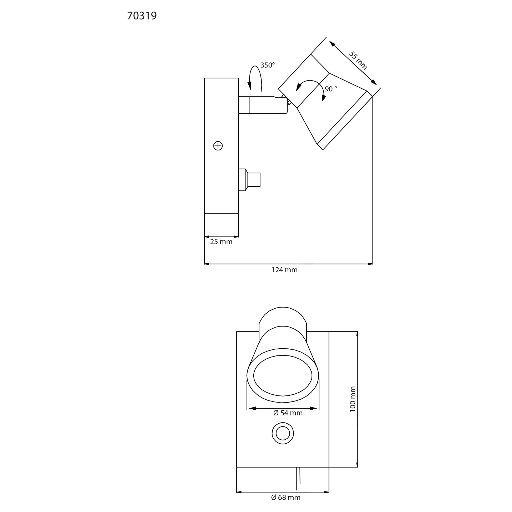En enkel vegglampe i sortlakkert metall med et justerbart lampehode. Lampen har én LED-lyskilde inkludert, som gir et behagelig varmhvitt lys. Denne kan dimmes med bryter på lampen. Lampen fungerer derfor perfekt som ekstra leselys over sengen. Monteres på veggen med medfølgende brakett.