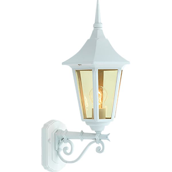 Dekorativ utelampe til vegg i støpt aluminium og akryl. Lampen er hvit og glasset er lett amberfarget. Lyset spres varmt utover. Til lampen trenger du 1stk lyskilde med E27-sokkel.