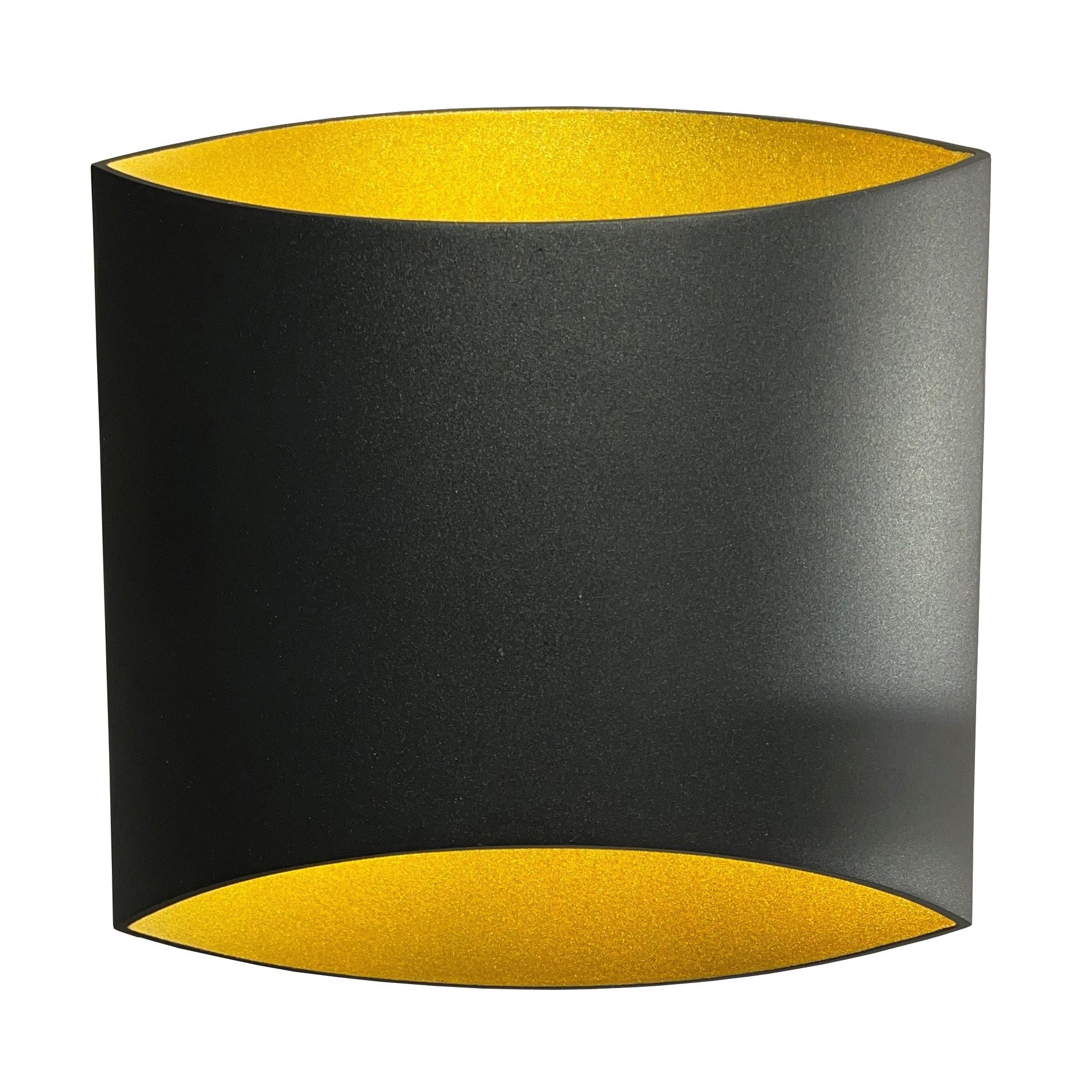 Dekorativ vegglampe i sort-utførelse med messingfarget innside. Innsiden lyses elegant opp og skaper et blikkfang i rommet. Lampen er designet for å være meget montasjevennlig og har åpen/ lukket tilkobling. Dimbar avhengig av valgt lyskilde (1 x E14).