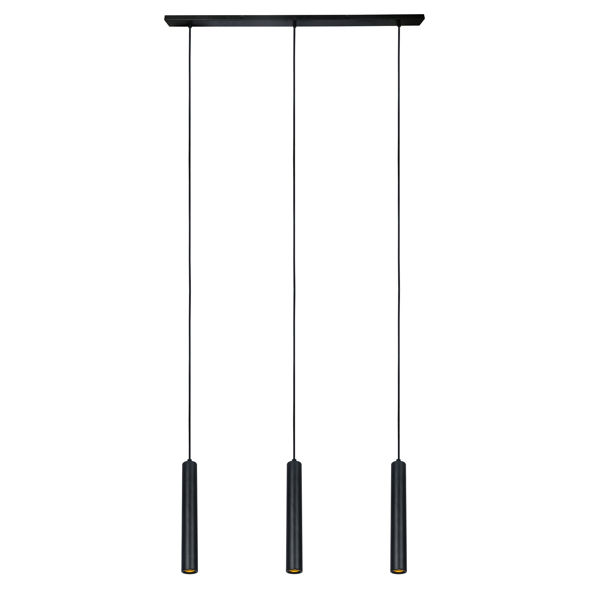 En enkel og delikat takpendel i sort base med tre lange sylindere i sort metall. Lampen gir et godt rettet lys nedover. Hver pendel har 200cm sort ledning (justerbar). Til lampen trenger du 3stk LED-pærer med GU10/MR11-sokkel. Monteres med brakett.