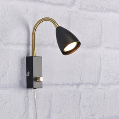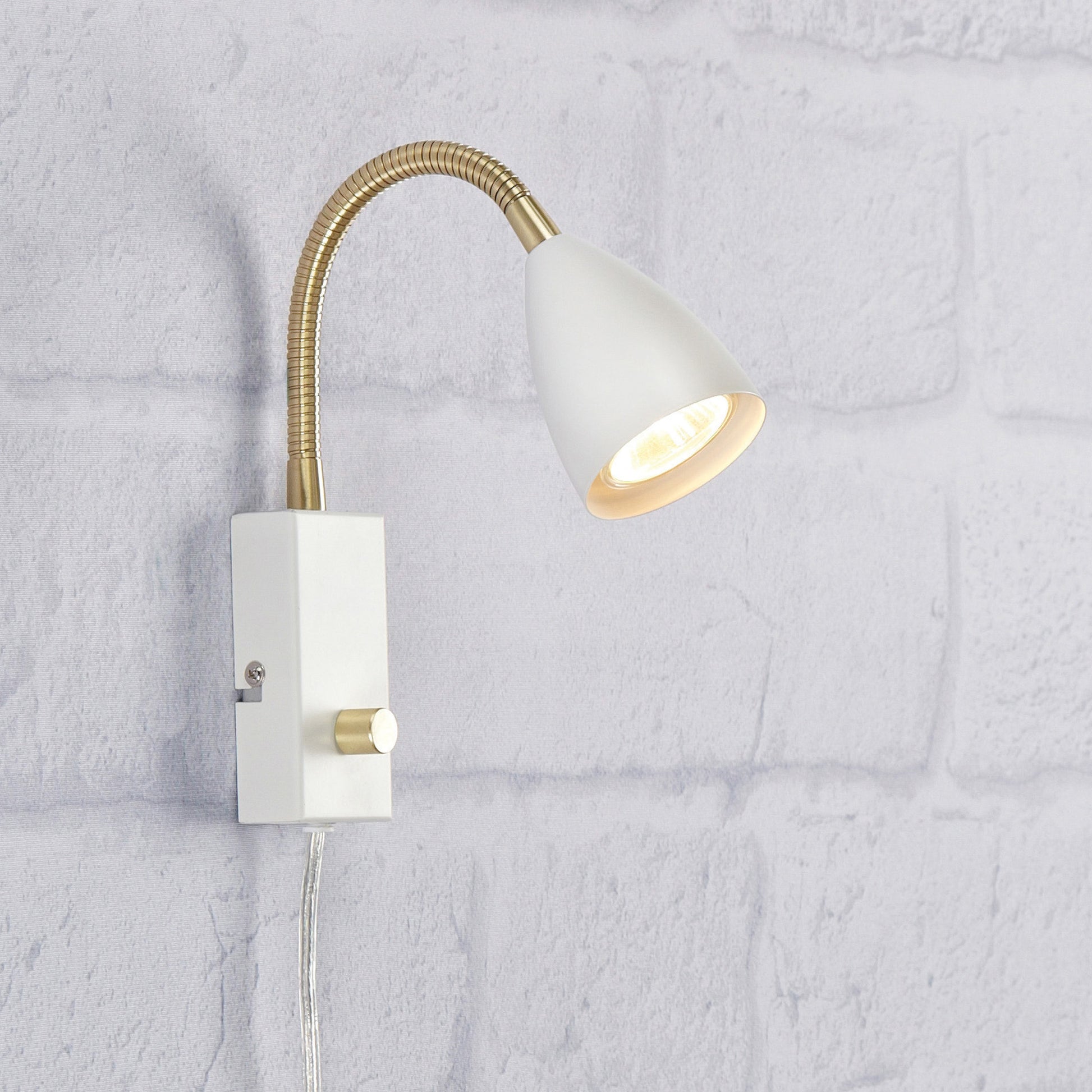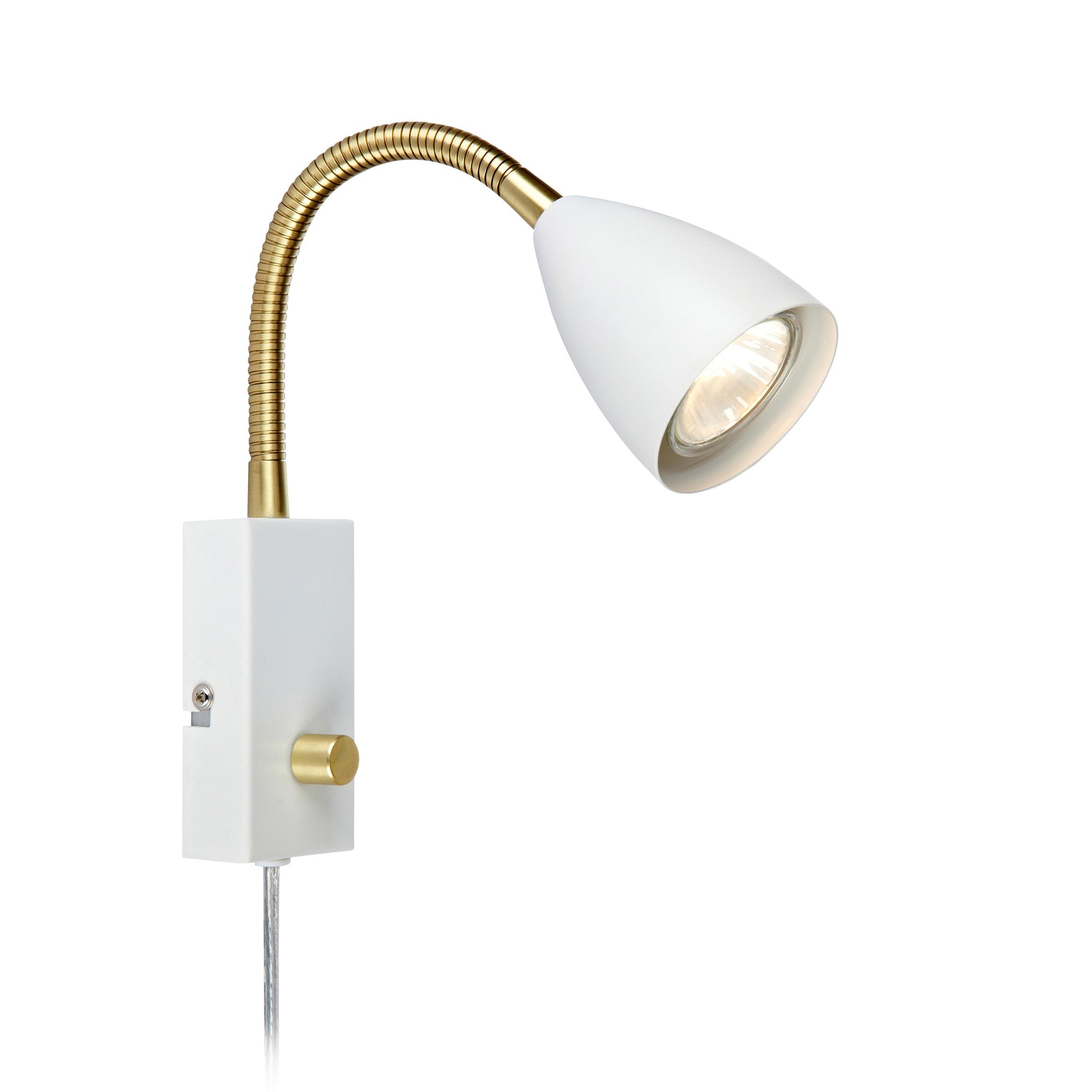 Hvit vegglampe i jern og messing med praktisk fleksibelt hode. Kommer med dimmer slik at du kan justere lyset. Lampen er perfekt leselys ved sengen. Til lampen trenger du en halogen- eller LED-pære med GU10 sokkel. Husk å velge en dimbar pære.