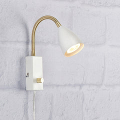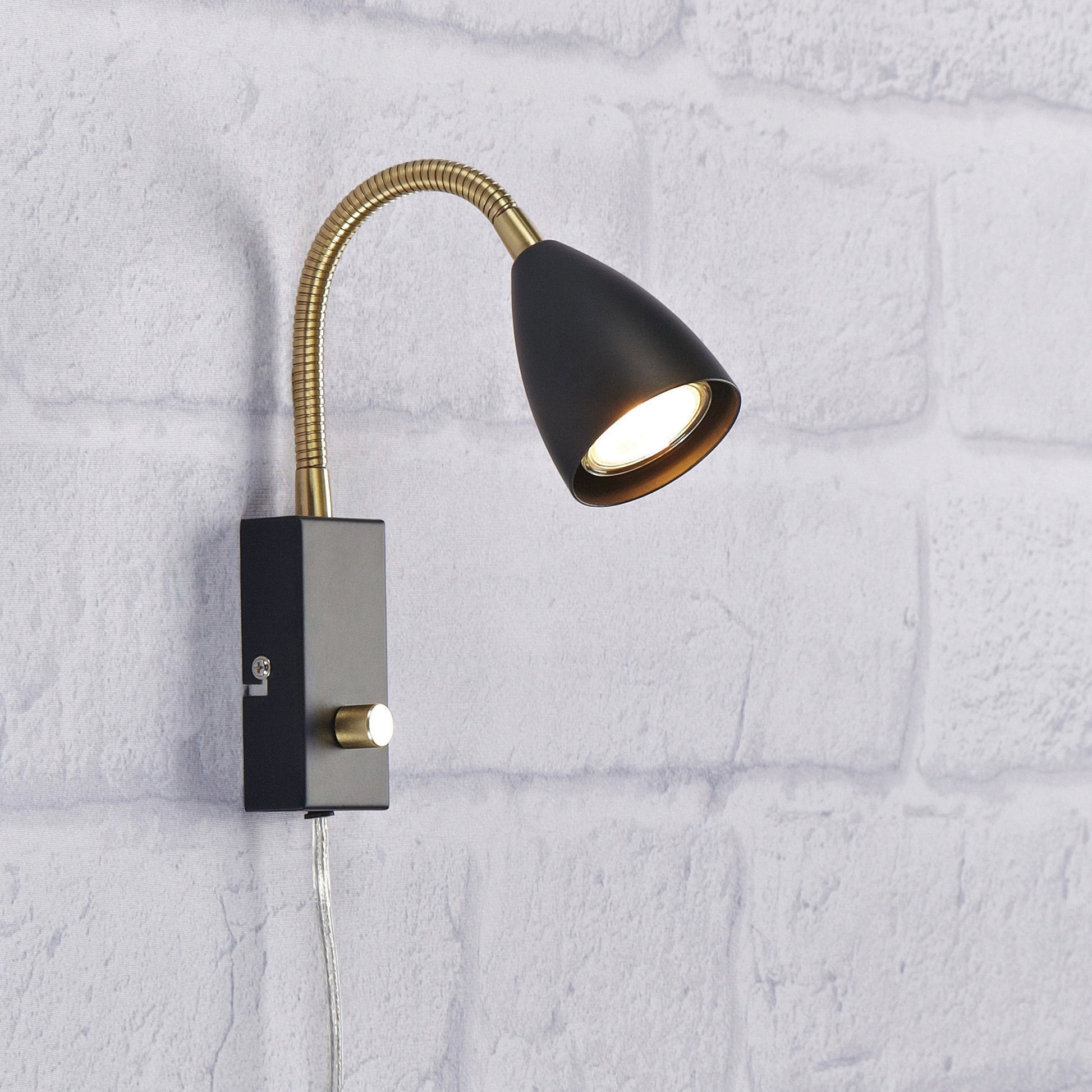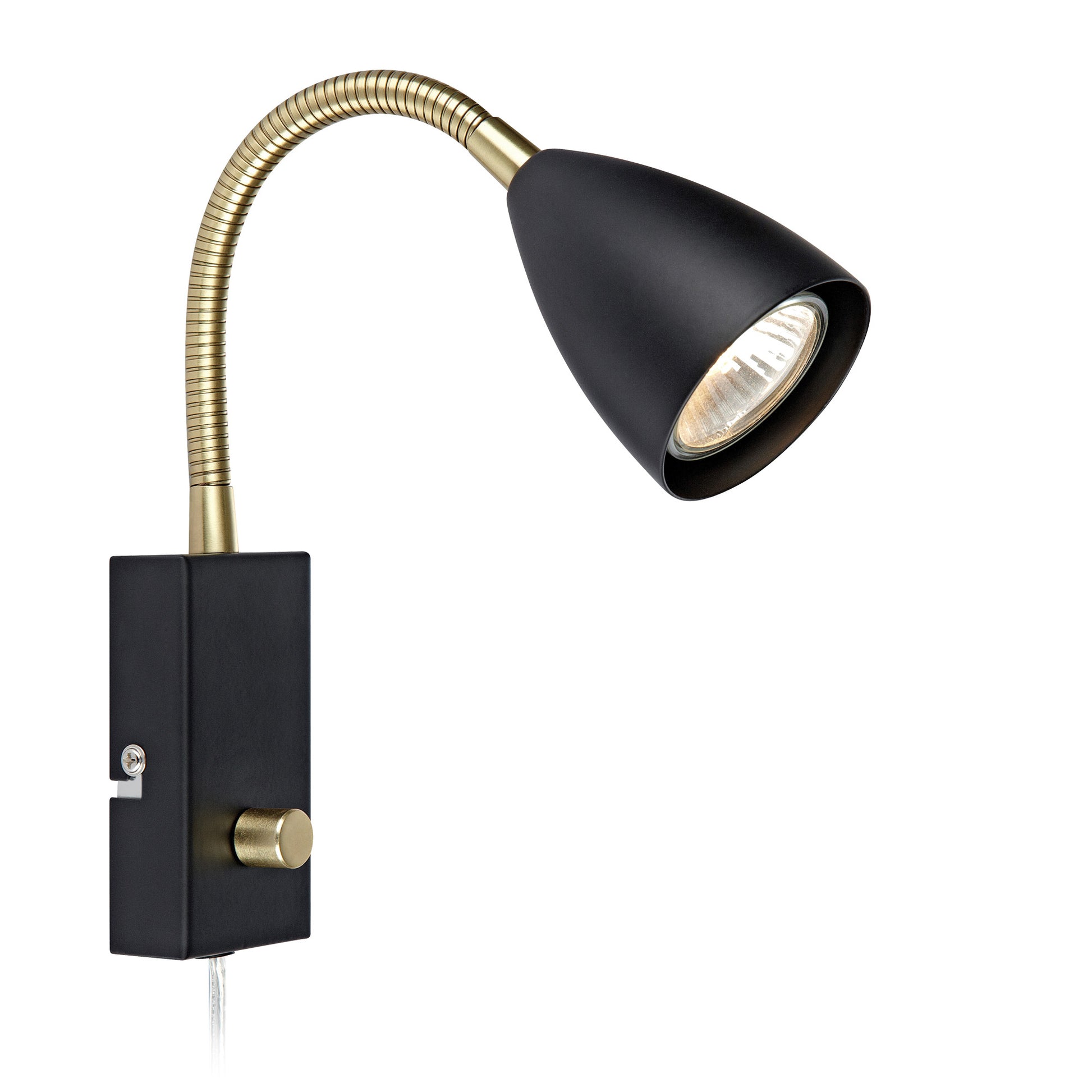 Sort vegglampe i jern og messing med praktisk fleksibelt hode. Kommer med dimmer slik at du kan justere lyset. Lampen er perfekt leselys ved sengen. Til lampen trenger du en halogen- eller LED-pære med GU10 sokkel. Husk å velge en dimbar pære.