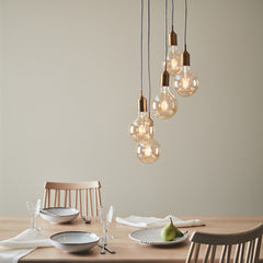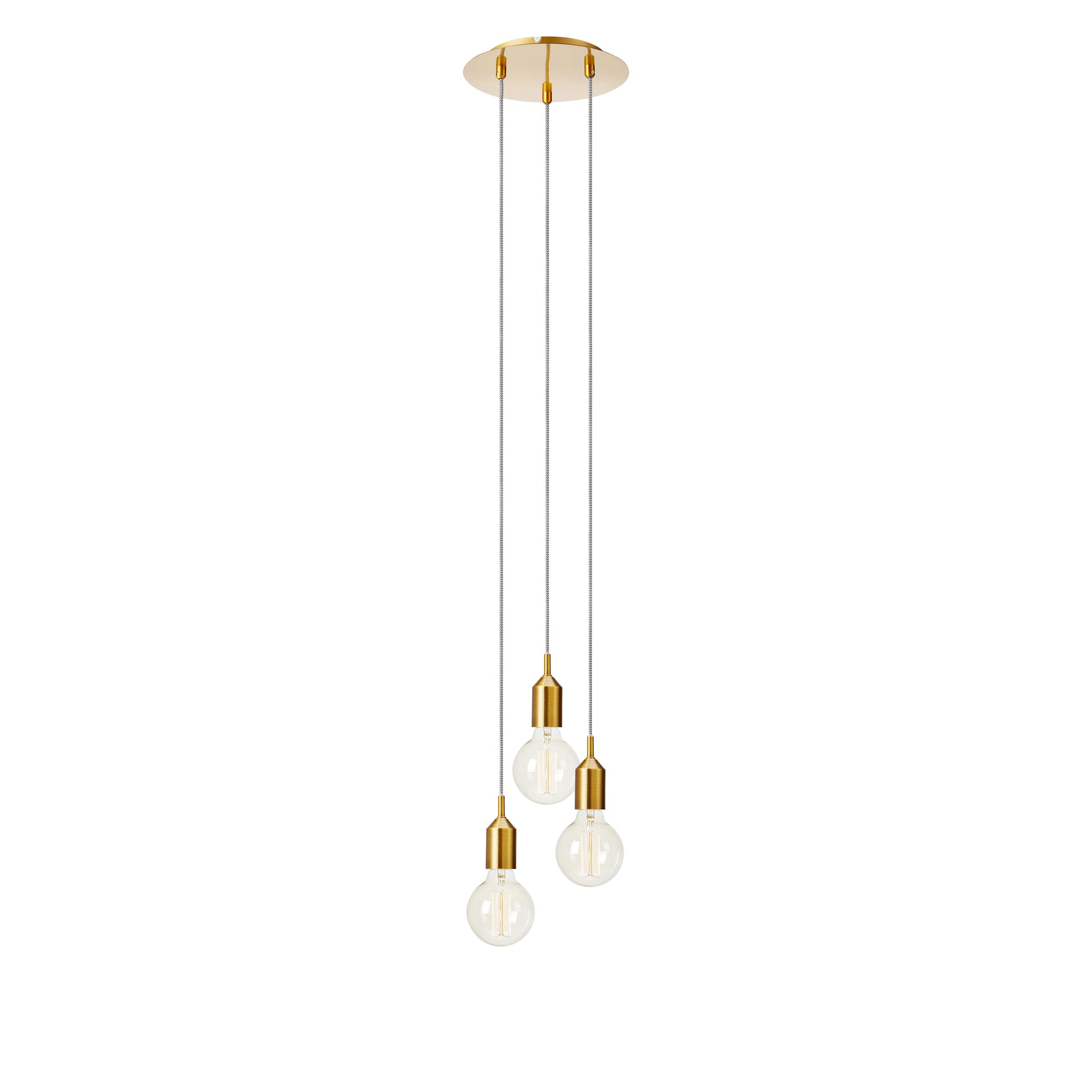 Stilren og urban 3-lys takpendel i bronsefarget metall. Lampen har tre hengende lampesokler ned fra en rund takplate i metall. Denne lampen passer perfekt over spisebordet eller kjøkkenøya. Lengden på opphengene kan reguleres til ønsket lengde, maks 150cm. Fullfør stilen på lampen ved å velge tre pærer med stor sokkel (E27). Vi synes lampen gjør seg ekstra godt med globepærer.