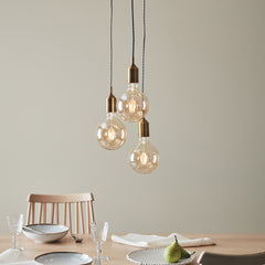 Stilren og urban 5-lys takpendel i bronsefarget metall. Lampen har fem hengende lampesokler ned fra en rund takplate i metall. Denne lampen passer perfekt over spisebordet eller kjøkkenøya. Lengden på opphengene kan reguleres til ønsket lengde, maks 150cm. Fullfør stilen på lampen ved å velge tre pærer med stor sokkel (E27). Vi synes lampen gjør seg ekstra godt med globepærer.