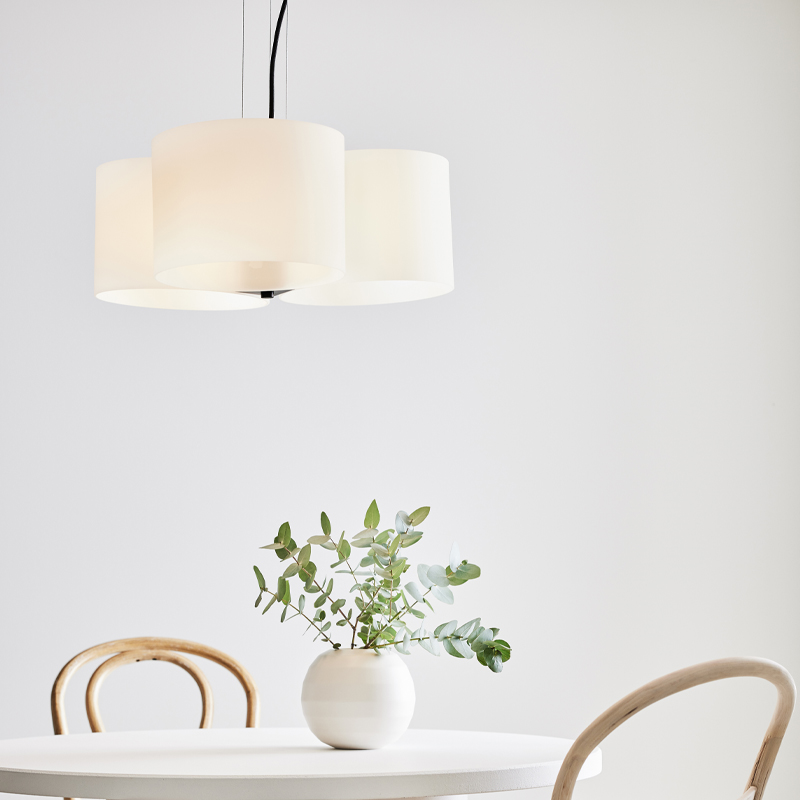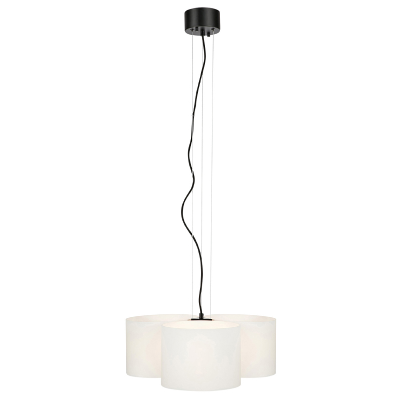 Vakker taklampe med tre, sammensatte, hvite glasskjermer og sorte detaljer. Pendelen passer inn i både landlige og moderne interiører. Diameter 51cm. Med sitt rene design gir lampen et vakkert inntrykk på kjøkkenet eller i stuen. Lyset spres mykt og behagelig. Til denne lampen trenger du 3stk pærer med liten E14 sokkel. Vi anbefaler matte, hvite dimbare pærer og å montere dimmer. Evt. smartpærer. 150cm lang ledning og krokoppheng.