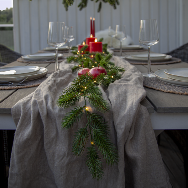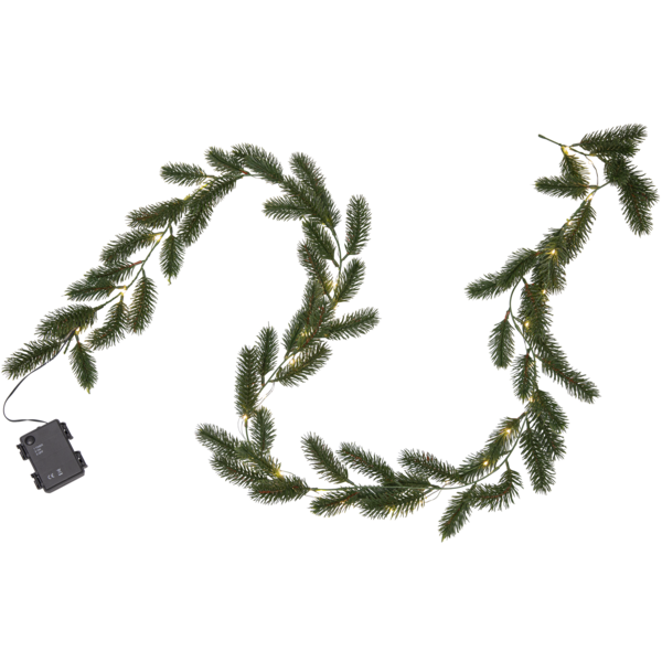 En borddekorasjon av mørkegrønne granbar i plastikk. Den er 180cm lang og har 30 varmhvite lys i LED. Passer perfekt å pynte bordet med i julen. 3stk AA-batterier må kjøpes utenom.