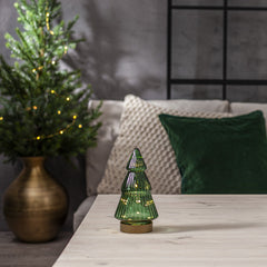 Stilig borddekorasjon i form av et tre, laget av gjennomsiktig grønt glass. Batteriboksen er skjult i den gullfargede basen. Drives av 2xAAA batterier (ikke inkludert). Julepynten passer perfekt til julebordet og bidrar til god stemning. Timerfunksjon med 6 timer på - 18 timer av, gjentagende.