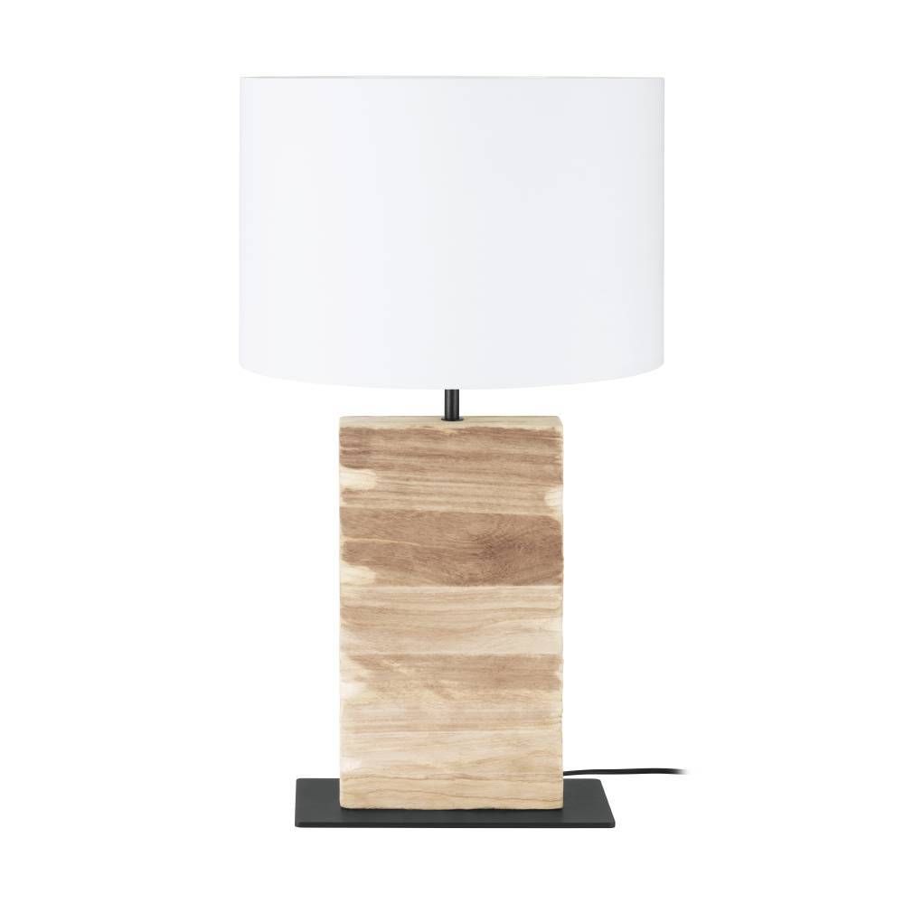 En dekorativ bordlampe med trefot og hvit skjerm i tekstil. Lampen passer perfekt i stuen eller på soverommet.