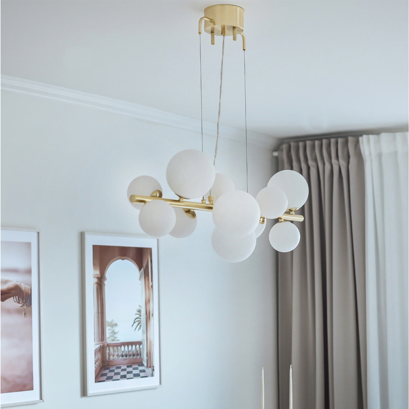 Molekyl 11-lys taklampe er en art deco inspirert lampe med et iøynefallende design. Lengde: 85cm. Lampen er laget i matt messing og har 11 kupler i opalglass. Lyset blir mykt og behagelig gjennom glassene. Vi anbefaler deg å montere dimmer for muligheten til å justere lyset etter behov. Monteres i taket med krok. Til denne trenger du pærer med G9 sokkel.