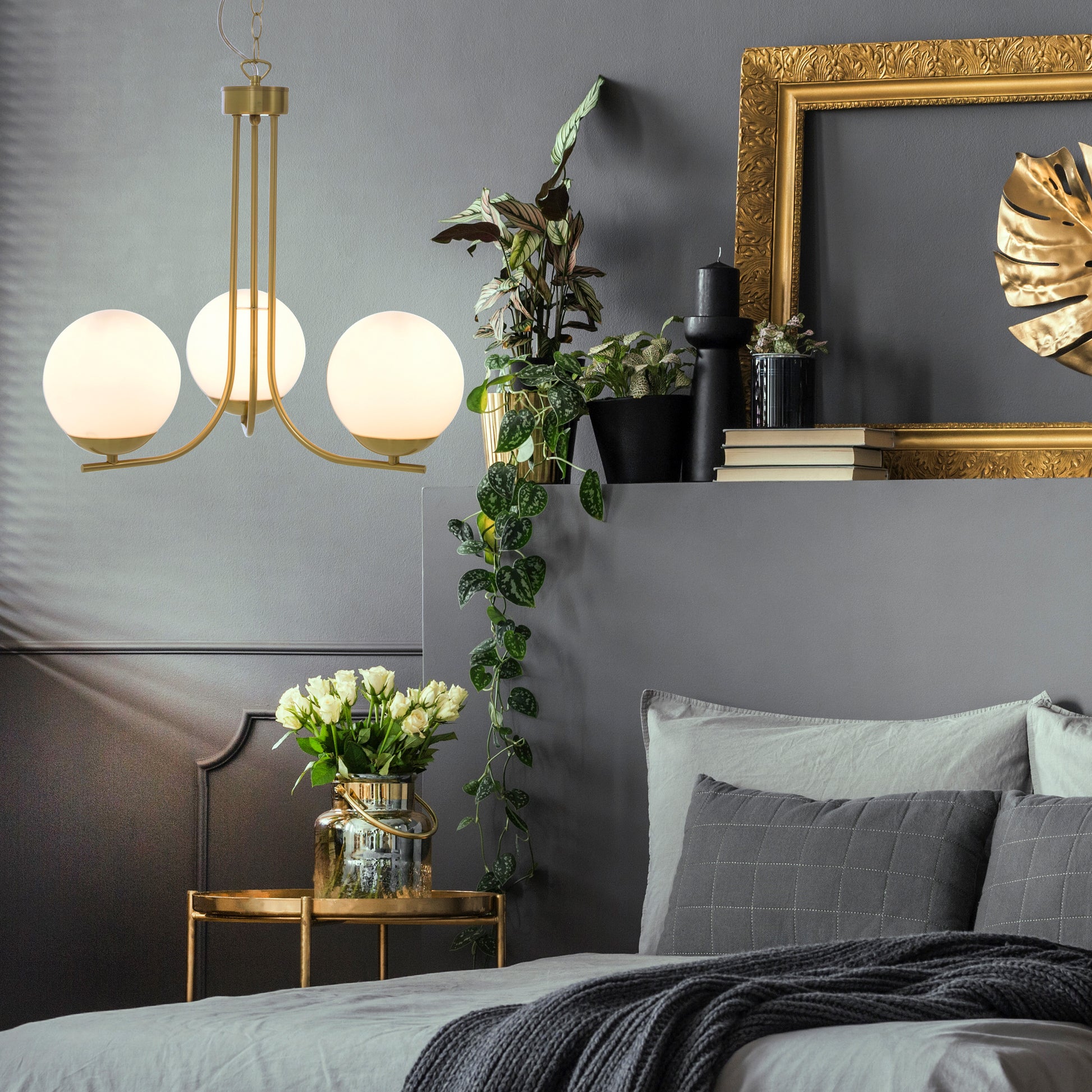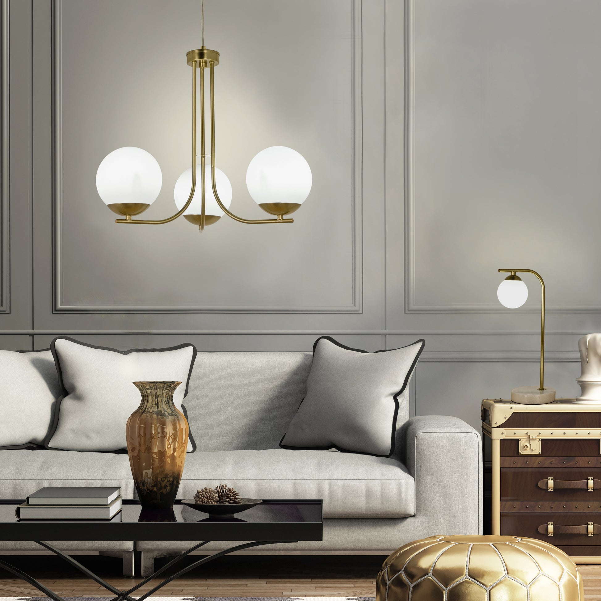 Nydelig taklampe i matt messing og tre hvite kupler. Lampen kan justeres i høyden med både kjetting og ledning.. Vi anbefaler matte pærer for mykt og behagelig lys. Sokkel E14. Krokoppheng for enkel montering og kjetting + takkopp i matt messing.