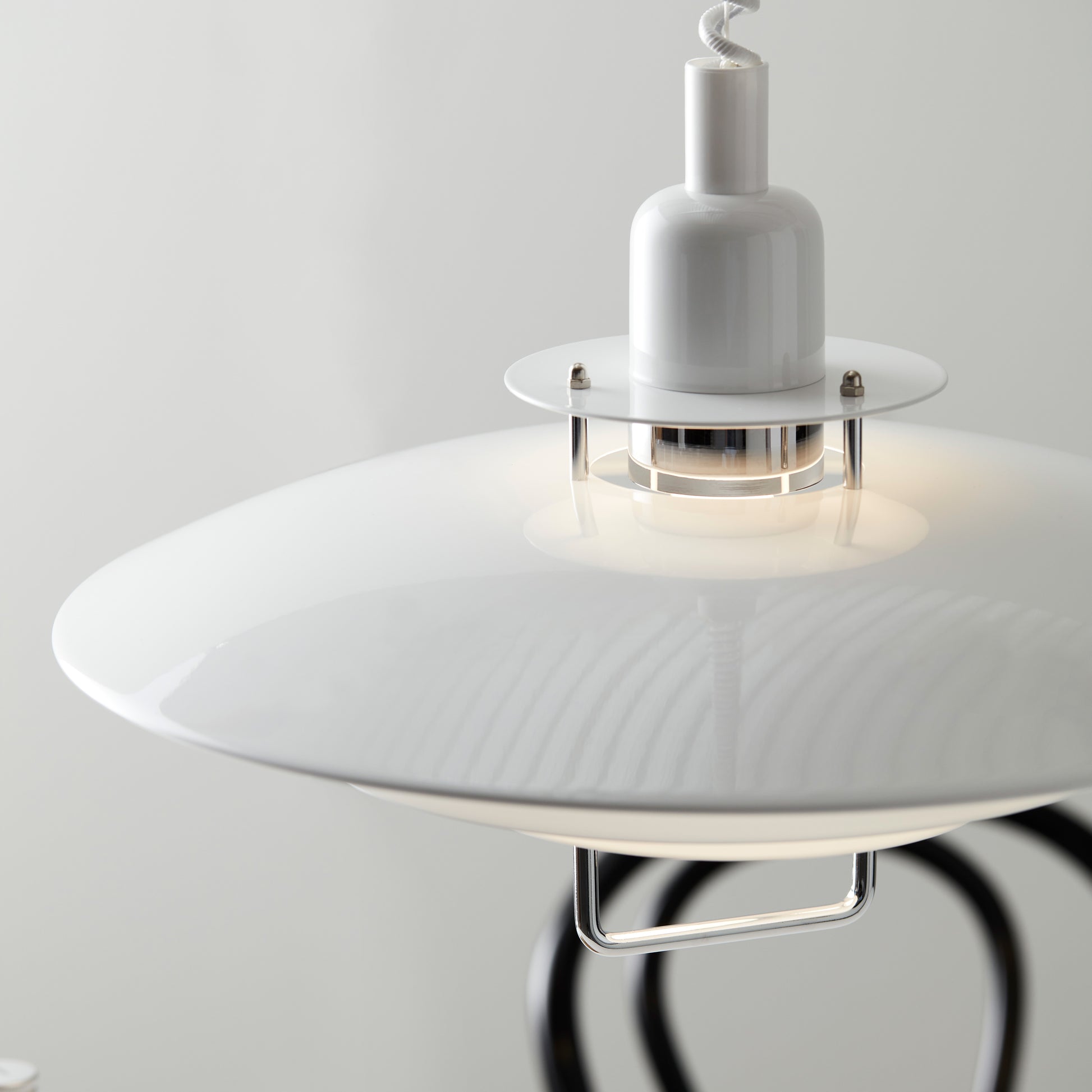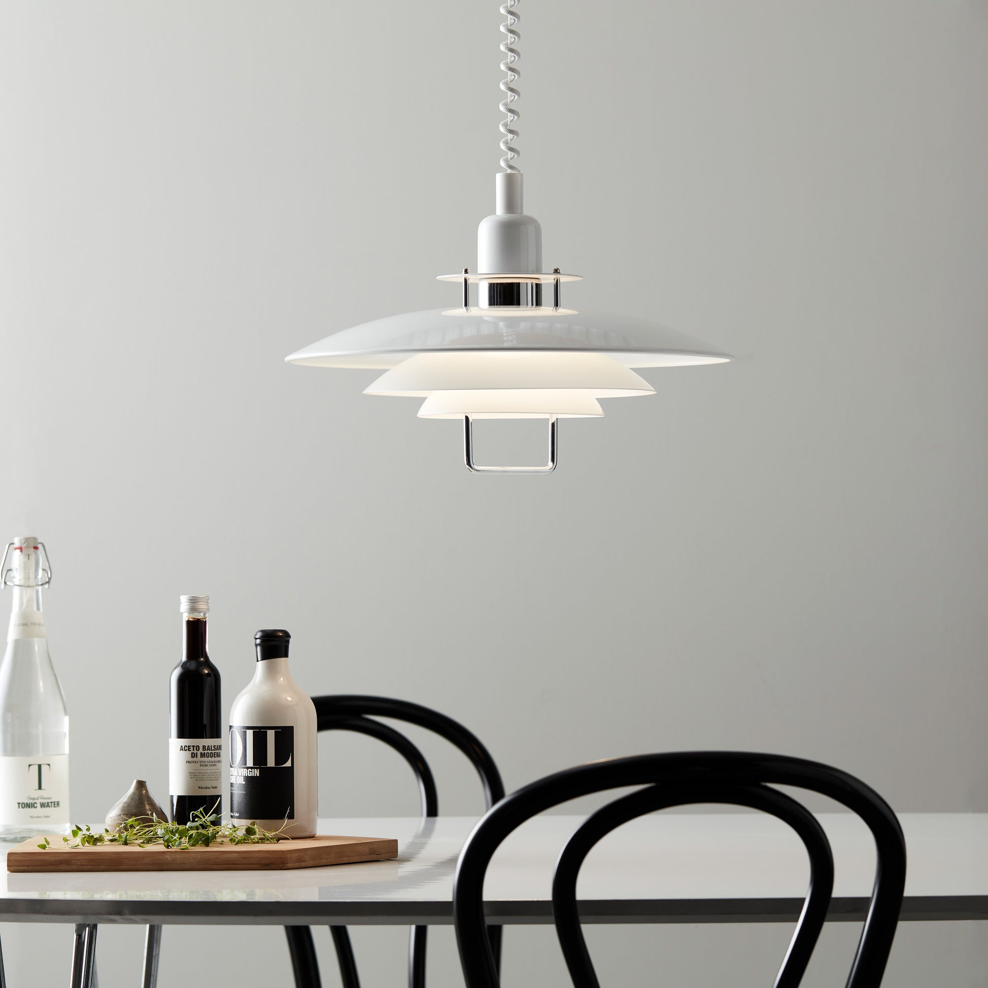 En lampe i høy kvalitet og med et klassisk - samtidig moderne - design. Pendelen er en utmerket kjøkkenlampe med hev- og senkefunksjon på minst 69cm og maks 150cm. Diameter 43cm. Laget i blank hvit metall og produsert i Sverige. Kan henges i takkrok. Normal E27 sokkel.