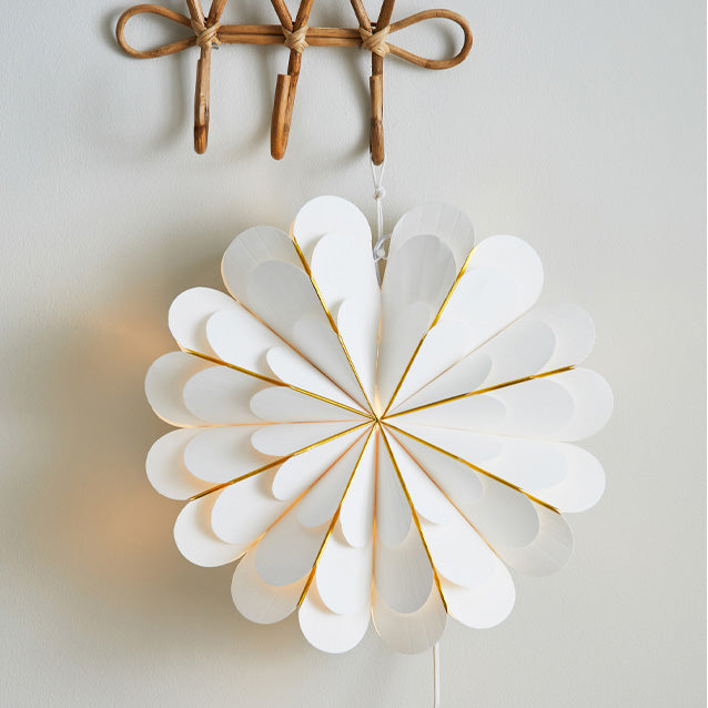 Hvit julestjerne til vinduet med blomsterformet skjerm i papir. Diameter 45cm. Det brettede papiret gir et stilig lysskinn. Kantene på det brettede papiret er gullfargede. Kommer med 350cm lang ledning med bryter. Liten (E14) sokkel. Husk å velge en LED-pære som gir deg stemningen du ønsker i både styrke og farge. Ekstra fin i gruppe med andre stjerner i Marigold-serien.