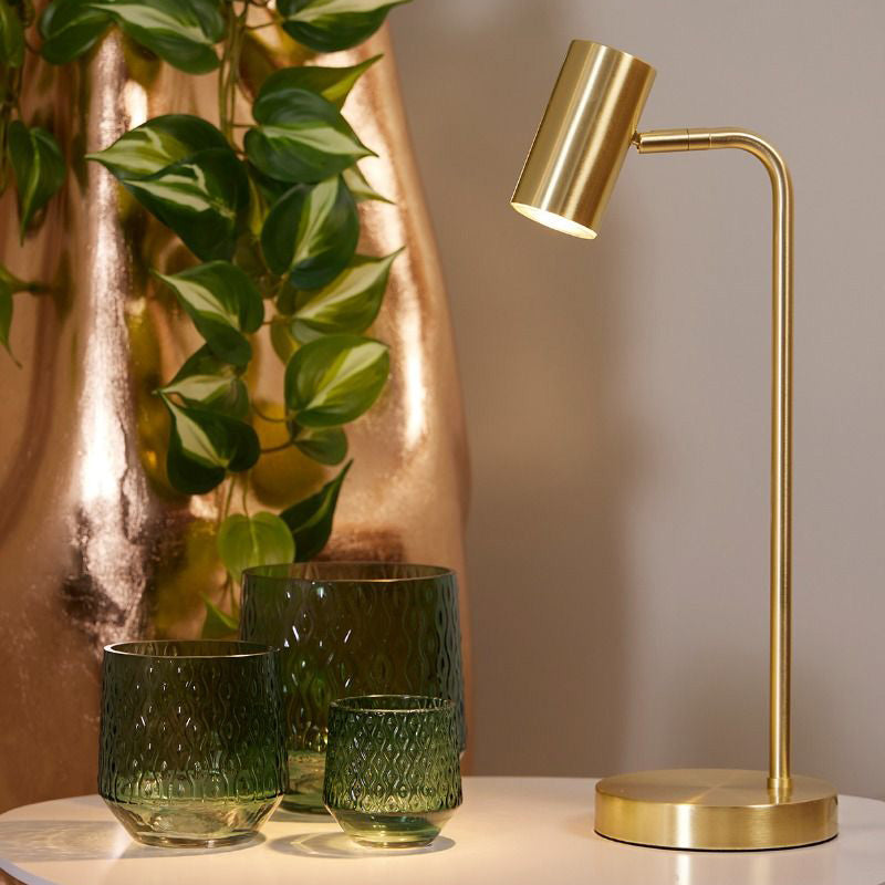 Stilren og nett bordspot i messing. Med sitt overhengende, justerbare lampehode er dette en perfekt leselampe. Høyde 47cm og diameter 15cm. Lampen kommer med 5W LED-pære, GU10 sokkel.